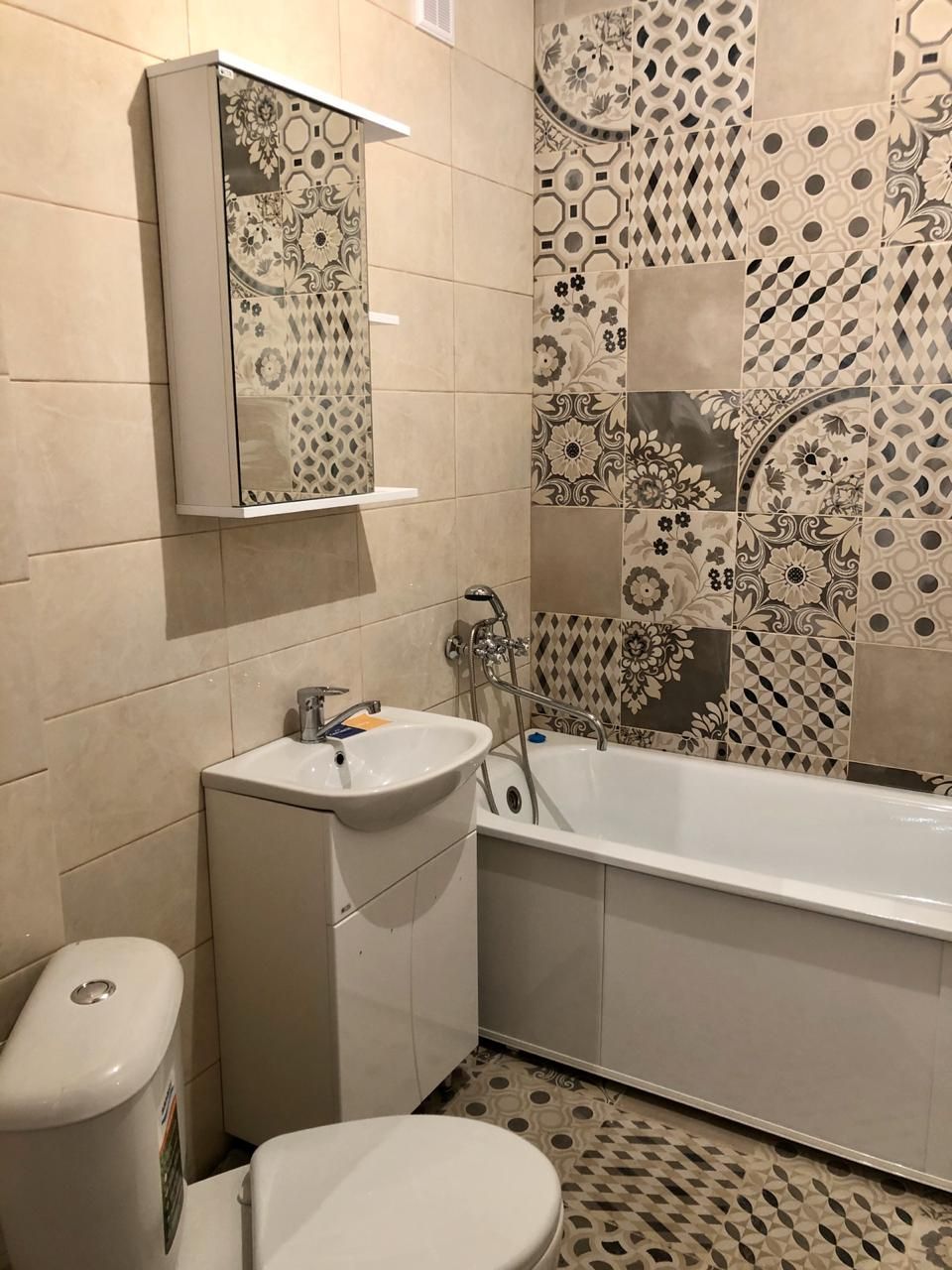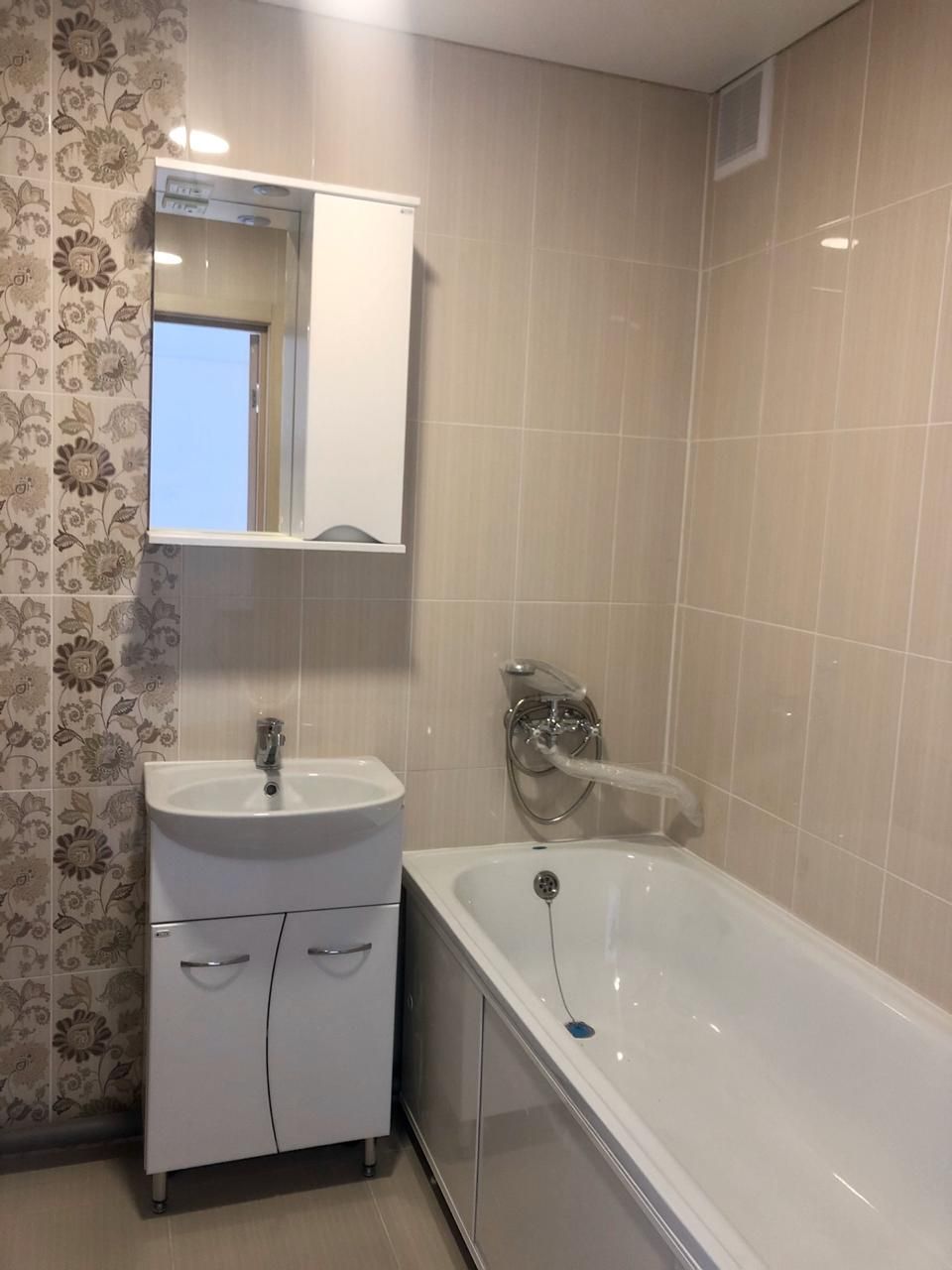 - Установлен комплект сантехники в санузле: ванна, унитаз, тумба с раковиной, подвесное зеркало;